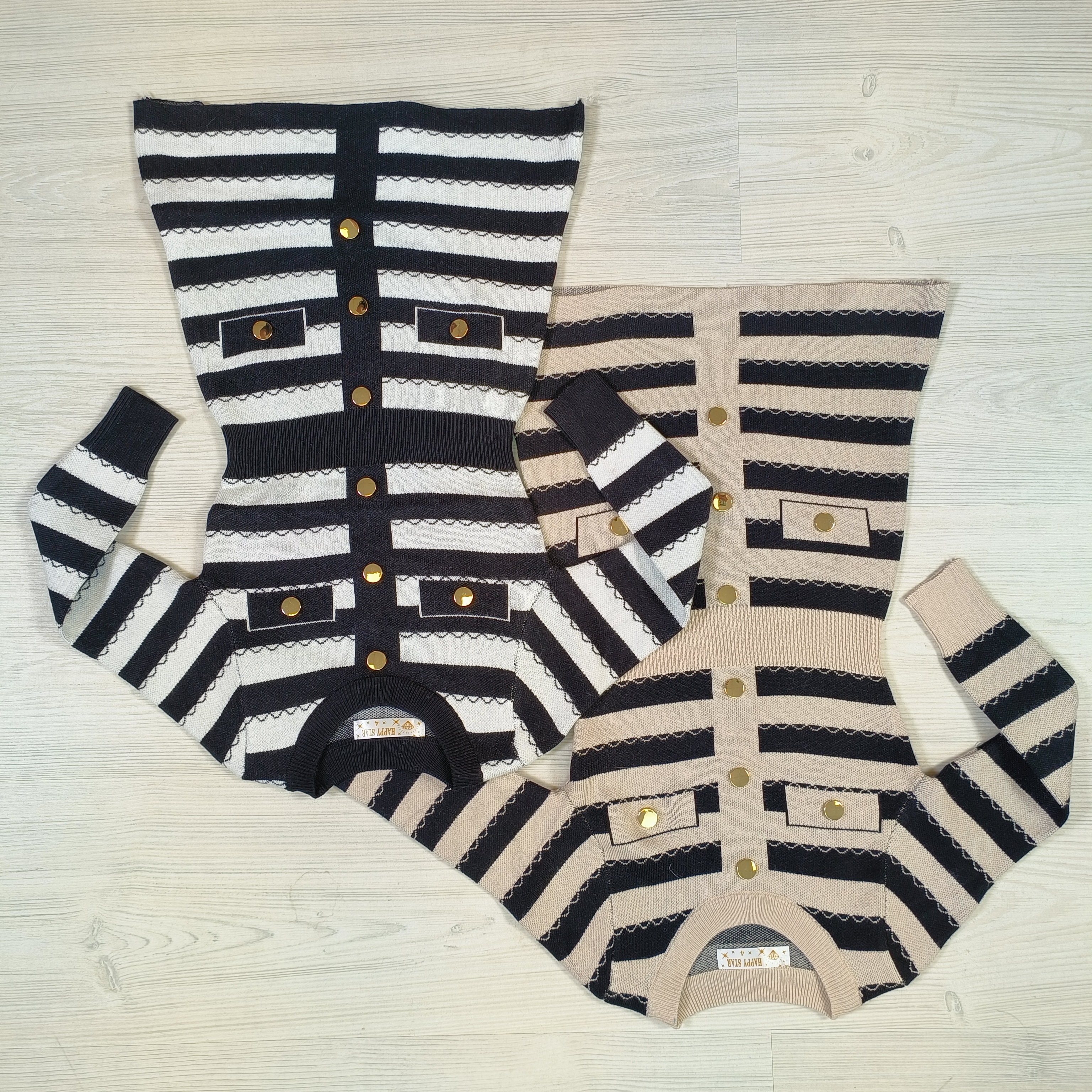 Artikelnummer: 3015 ww1 OverzichtChique Gebreide Meisjesjurk – Gestreept Design met Gouden Knopen