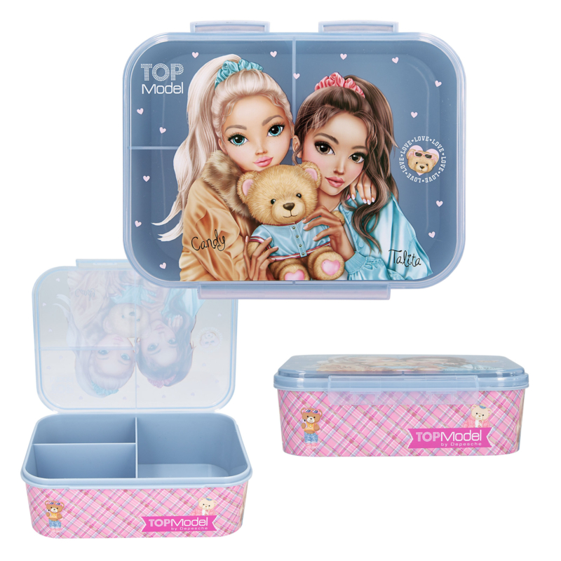 Artikelnummer: 13255 OverzichtEen roze broodtrommel, drie aparte vakken, een blauw-transparante deksel, een trendy blokjesmotief en heel veel teddytastische TOPModel style. Niet geschikt voor de vaatwasser en de magnetron.