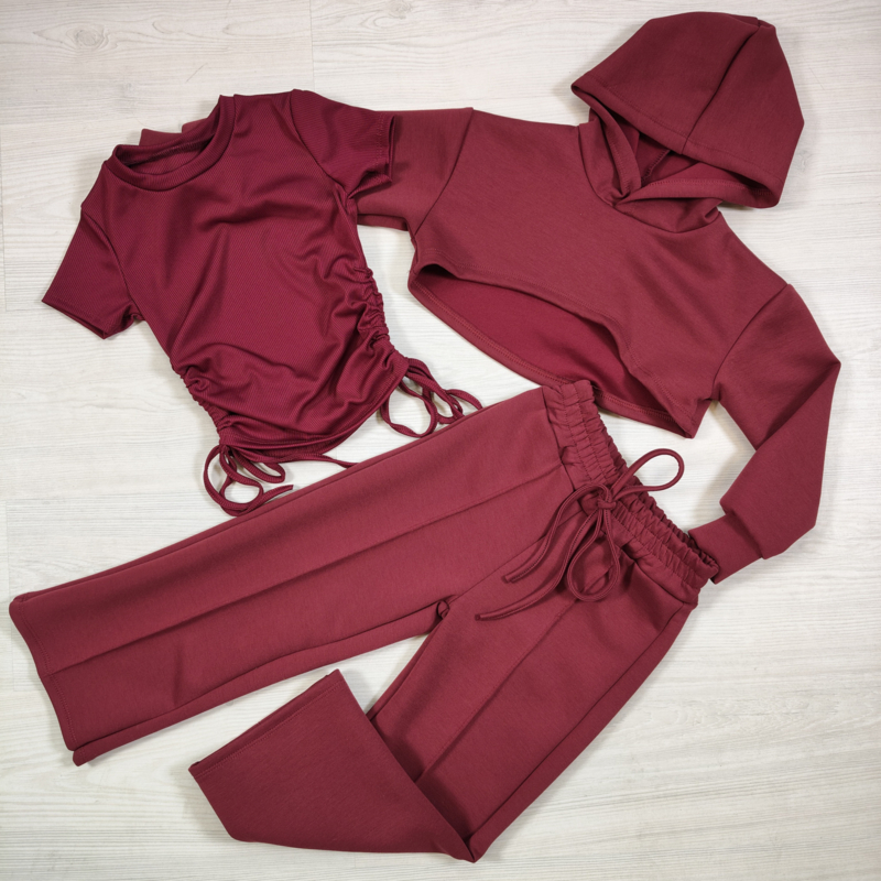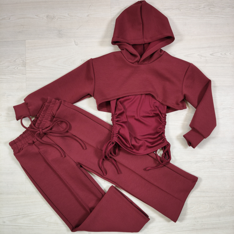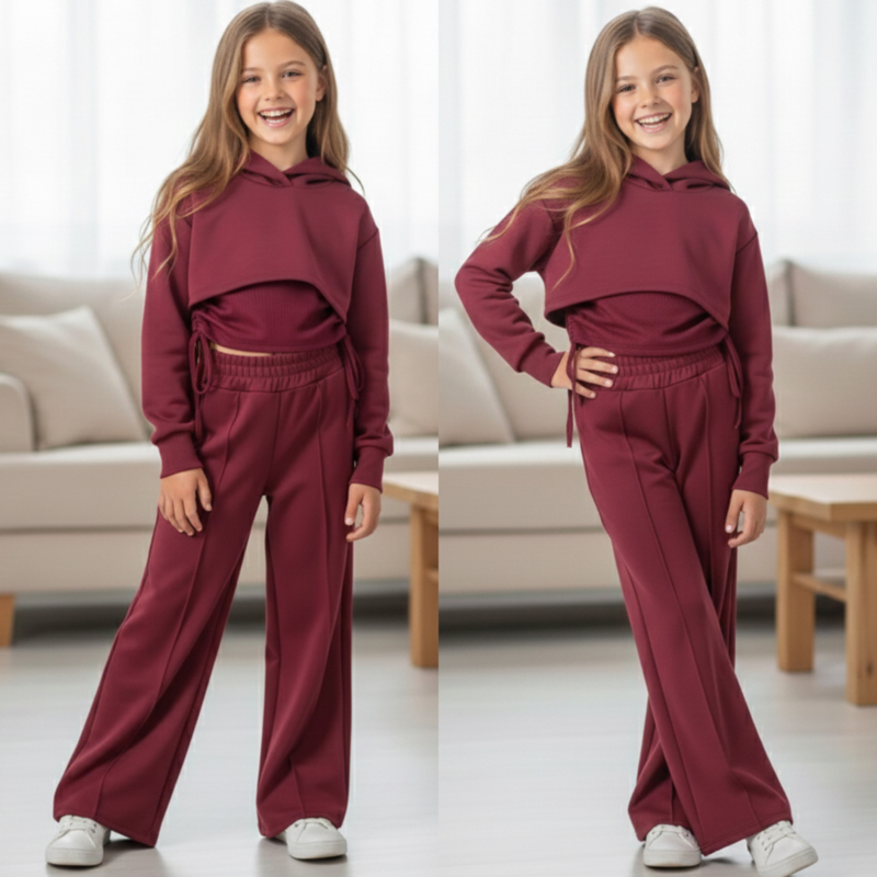 Ontdek deze veelzijdige 3-delige set, perfect voor actieve kinderen die houden van comfort én stijl! De set bestaat uit een cropped hoodie, een ruched T-shirt met verstelbare zijdetails en een bijpassende broek met elastische taille en koordje voor een perfecte pasvorm.
