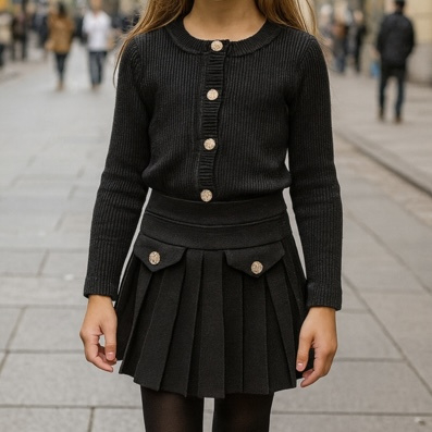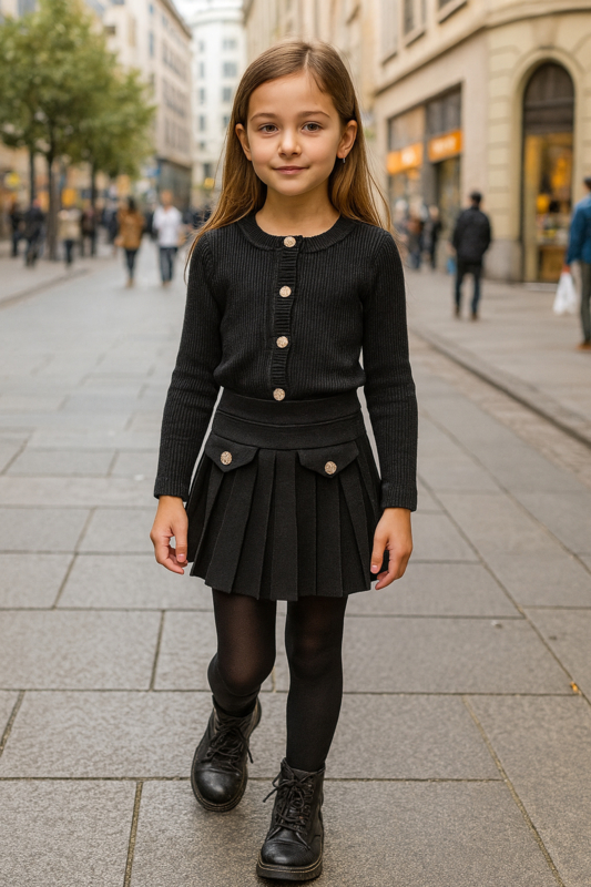 Artikelnummer: 3903z ww1 OverzichtGa voor een tijdloze en elegante look met dit zwarte setje bestaande uit een fijngebreid vest en een geplooide rok. Het vestje is afgewerkt met glanzende sierknopen die een chique uitstraling geven, terwijl de rok met plooien zorgt voor een speels maar stijlvol effect. Dit setje is perfect voor feestjes, familie-uitjes of een fashionable dag naar school. Comfortabel, zacht en toch heel classy. Verkrijgbaar in maat 98/104 t/m 158/164.
