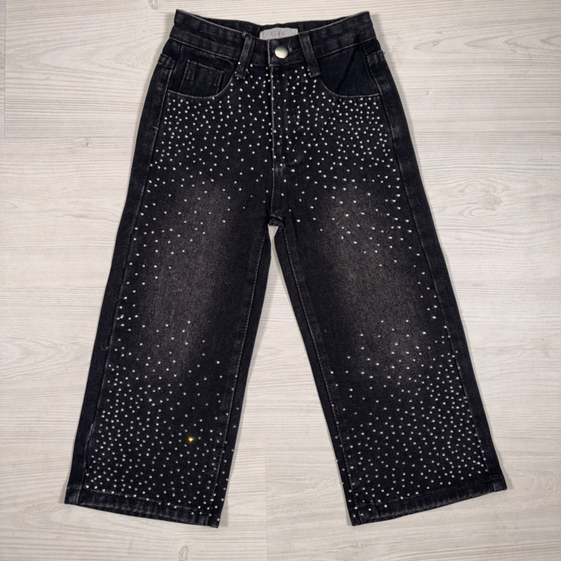 Artikelnummer: 361z OverzichtLaat jouw girl stralen in deze prachtige glitter spijkerbroek! Deze zwarte wide-leg jeans is bezaaid met subtiele strass steentjes die van boven naar beneden in een mooie sprinkle-effect verlopen. Gemaakt van stevig, comfortabel denim met een fijne stretch, zodat hij heerlijk zit en moeiteloos meegaat in elke beweging.