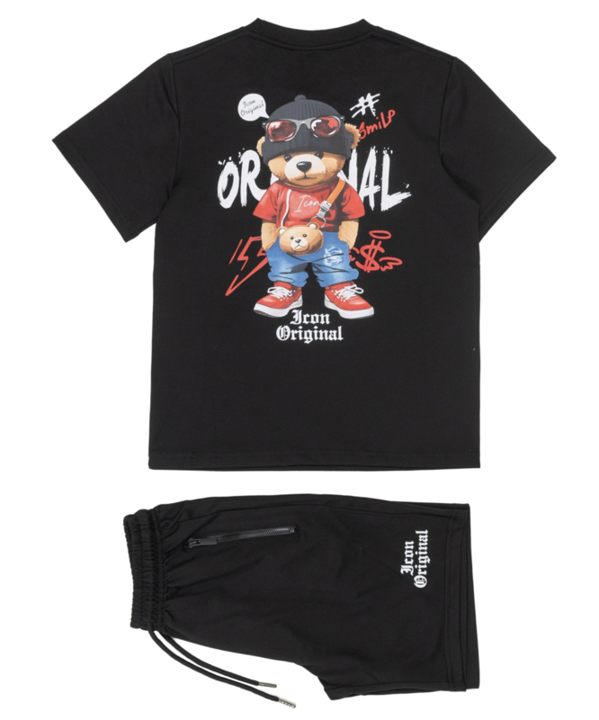 De voorkant van het T-shirt is clean met een subtiel #ICON Original logo op de borst, terwijl de achterkant is voorzien van een grote streetstyle bear-print met ICON ORIGINAL tekst en graffiti details. De short heeft een elastische tailleband met koord, een handig ritszakje én een klein #ICON Original logo op de pijp.