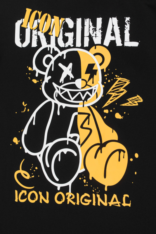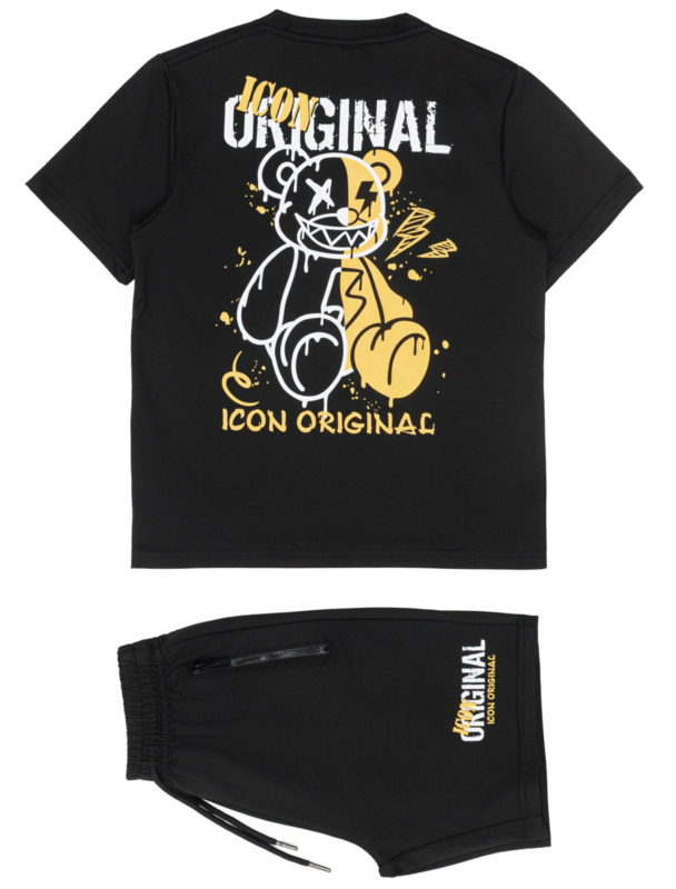 De set bestaat uit een zwart T-shirt met opvallende bear-print op de achterkant en bijpassende short met ritszakje. De graphic print met geel accent geeft de outfit een echte urban vibe.