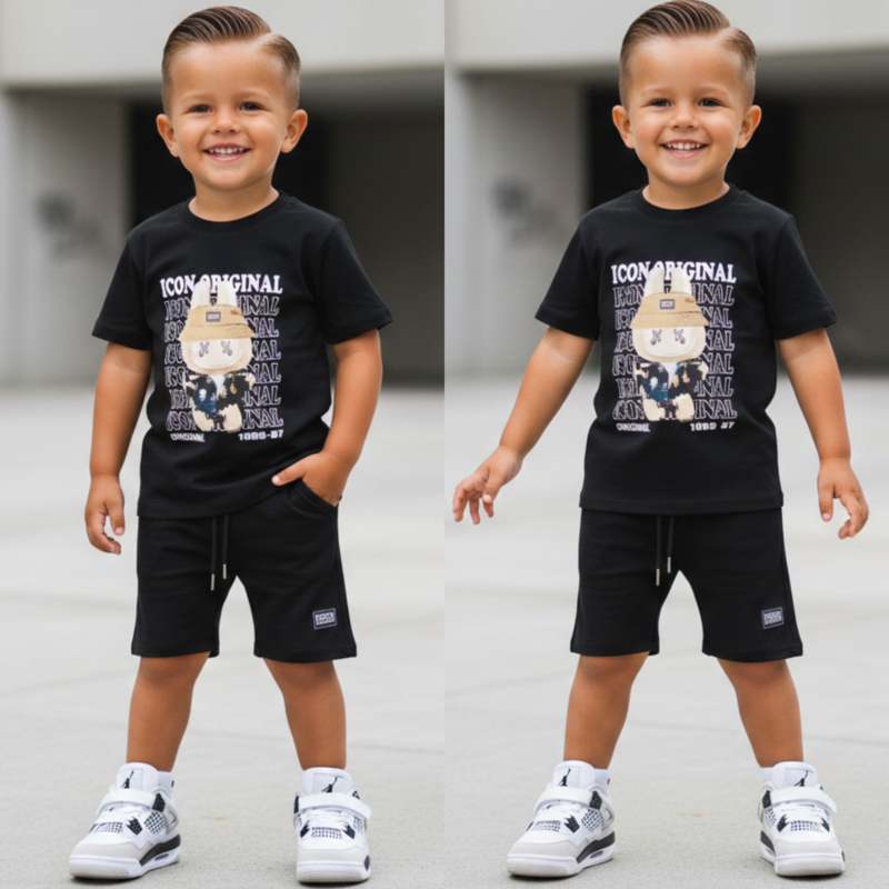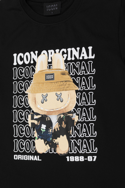 Het shirt heeft een opvallende print met herhaalde “Icon Original” tekst op de achtergrond en een stoere bunny met bucket hat voor die echte streetstyle vibe. De short is afgewerkt met een handige ritszak aan de zijkant en een subtiel Icon-label, super praktisch én trendy.