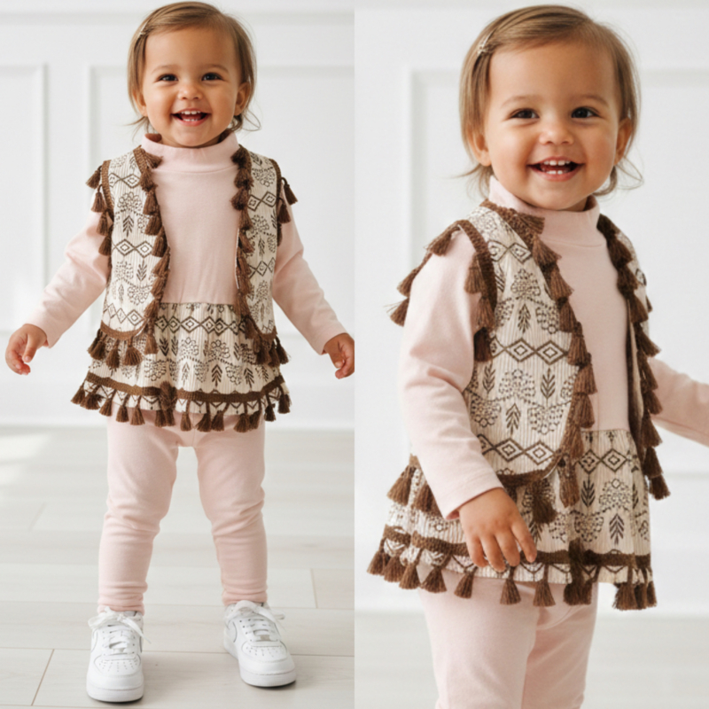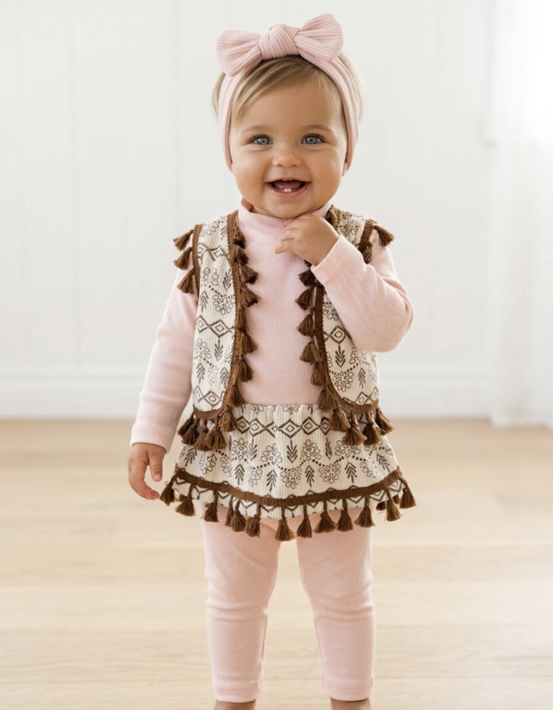 Dit is een 3-delig babysetje met shirt, tuniek/rokje met franjes en legging in zachte tinten — helemaal boho chic 🤎