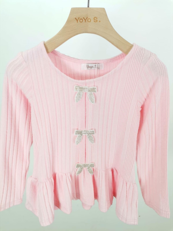 Artikelnummer: 3432r ww1 OverzichtDit schattige meisjes shirt met strikjes is een echte eyecatcher! Het shirt is gemaakt van een zachte ribstof met stretch en heeft een speels peplum model met een licht uitlopend rokje aan de onderkant. De drie glinsterende strikdetails aan de voorkant geven het shirt een super girly en luxe uitstraling.