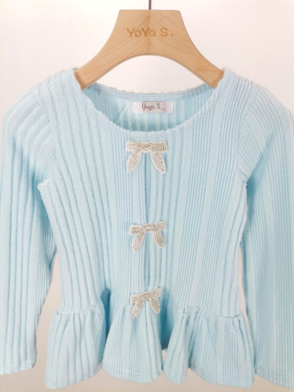 Artikelnummer: 3432b ww1 OverzichtDit schattige meisjes shirt met strikjes is een echte eyecatcher! Het shirt is gemaakt van een zachte ribstof met stretch en heeft een speels peplum model met een licht uitlopend rokje aan de onderkant. De drie glinsterende strikdetails aan de voorkant geven het shirt een super girly en luxe uitstraling.