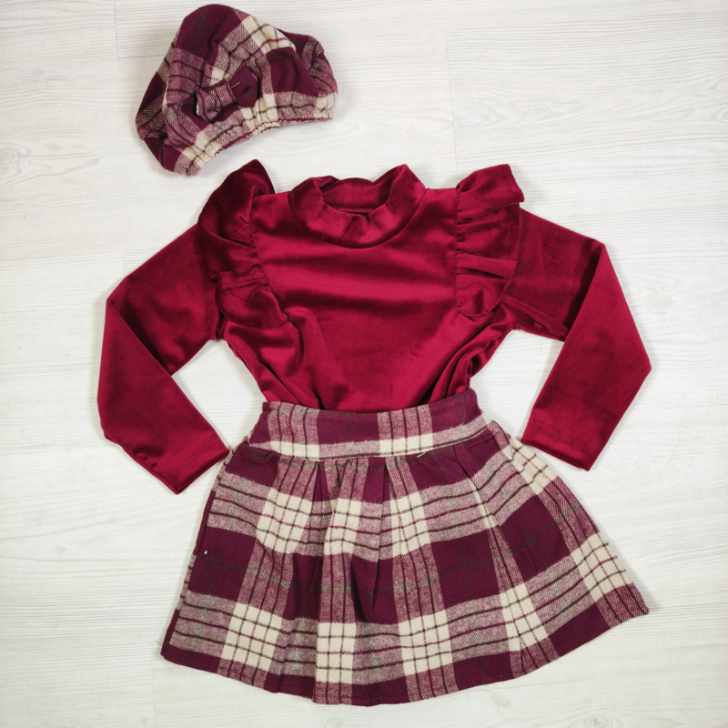 Artikelnummer: HN.25489 ww1 OverzichtMet dit stijlvolle 3-delige setje ziet elke meid er meteen chic en trendy uit. De set bestaat uit een zachte velvet top met lange mouwen, een geruit rokje en een bijpassend baretje voor een complete, fashionable look. De velvet stof geeft het setje een luxe uitstraling, terwijl het klassieke ruitpatroon zorgt voor een tijdloze charme.