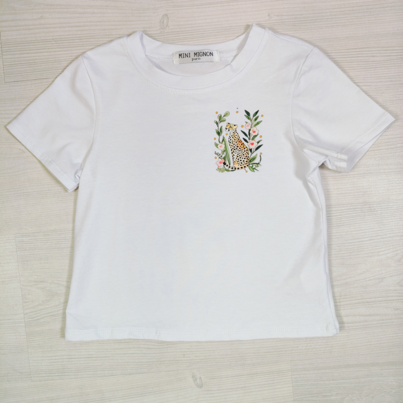 Artikelnummer: HN.ts168j ww1 OverzichtDit stijlvolle meisjes T-shirt met luipaard en bloemenprint combineert een stoere touch met een lieve, romantische uitstraling. De kleine luipaardillustratie omringd door bloemen en blaadjes zorgt voor een subtiele maar super trendy look.