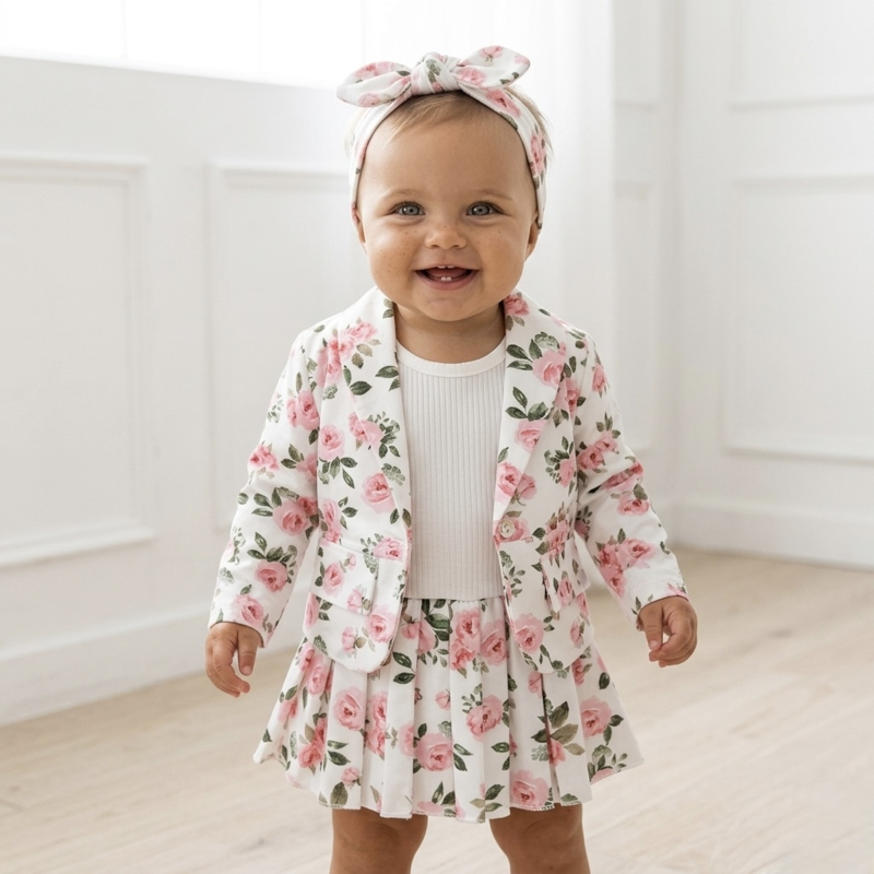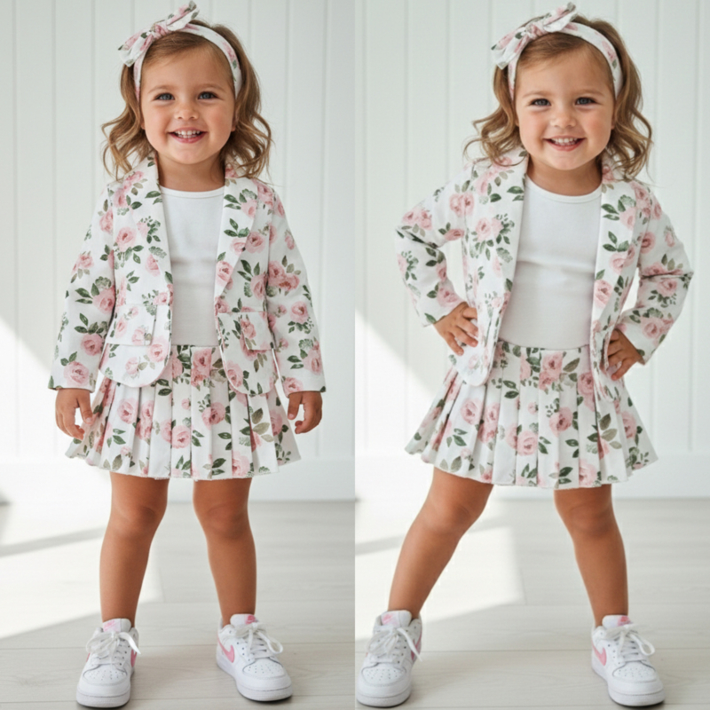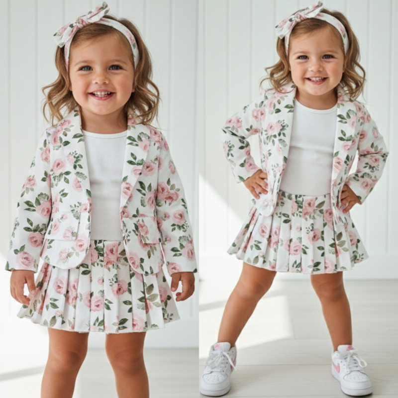 Artikelnummer: HN.25bf071 OverzichtDit schattige 3-delige setje is een echte eyecatcher voor baby’s en peuters. De set bestaat uit een zacht jurkje met rozenprint, een bijpassende blazer en een lief haarbandje voor een complete en stijlvolle look.
