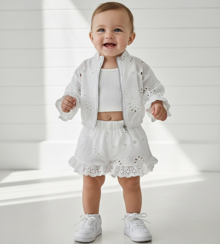 Artikelnummer: LG.26bf004 OverzichtDeze broderie baby set in wit is een echte must-have voor de zomer. Het setje bestaat uit een licht jasje met broderie details, een zacht rib topje en een bijpassend shortje met sierlijke ruches. De luchtige stof en comfortabele pasvorm maken dit outfitje perfect voor warme dagen.