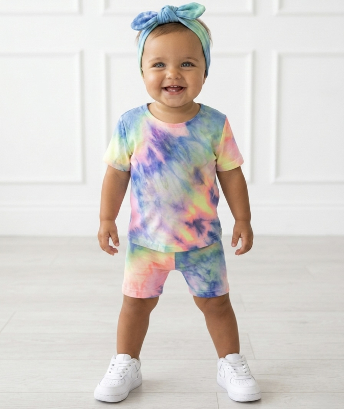 Artikelnummer: LG.20f097b OverzichtDit vrolijke tie-dye meisjes setje met T-shirt en biker short is dé perfecte outfit voor zonnige dagen! De speelse mix van blauw, roze, groen en pastelkleuren zorgt voor een frisse, trendy look waar ieder meisje blij van wordt.
