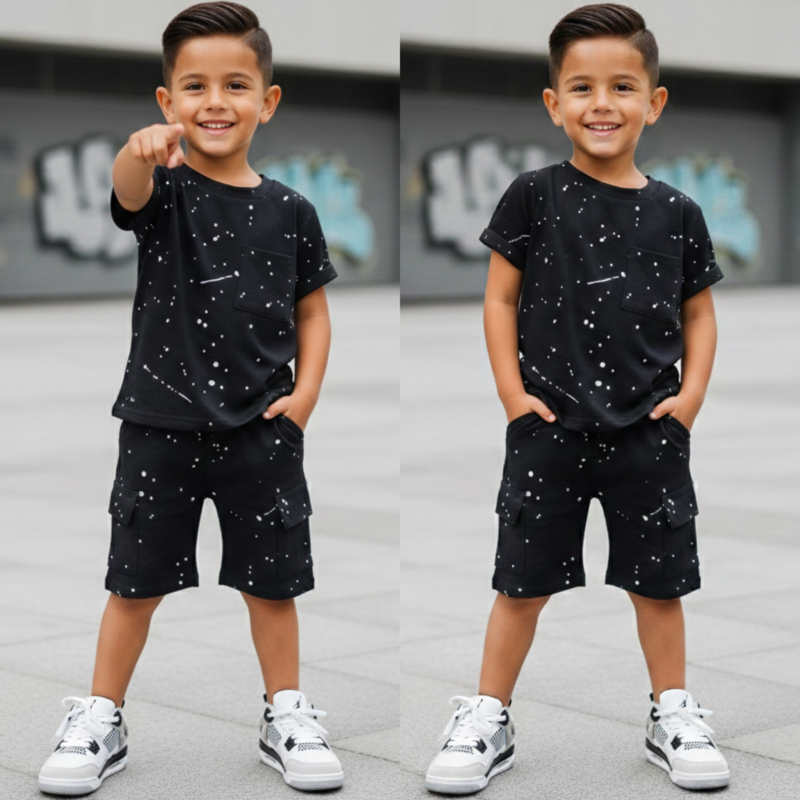 Artikelnummer: hugoz HN OverzichtDeze stoere zwarte jongens zomerset met T-shirt en cargo short is een echte must-have voor elke garderobe. De tijdloze zwarte kleur met speelse spikkelprint geeft een coole streetwear look en past overal bij.