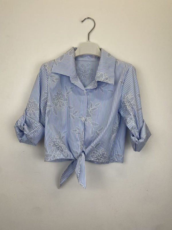 De blouse heeft een klassieke kraag en knoopsluiting, en kan aan de onderkant leuk geknoopt worden voor een trendy cropped look. De mouwen zijn opgerold te dragen voor een casual vibe – ideaal voor warme dagen.