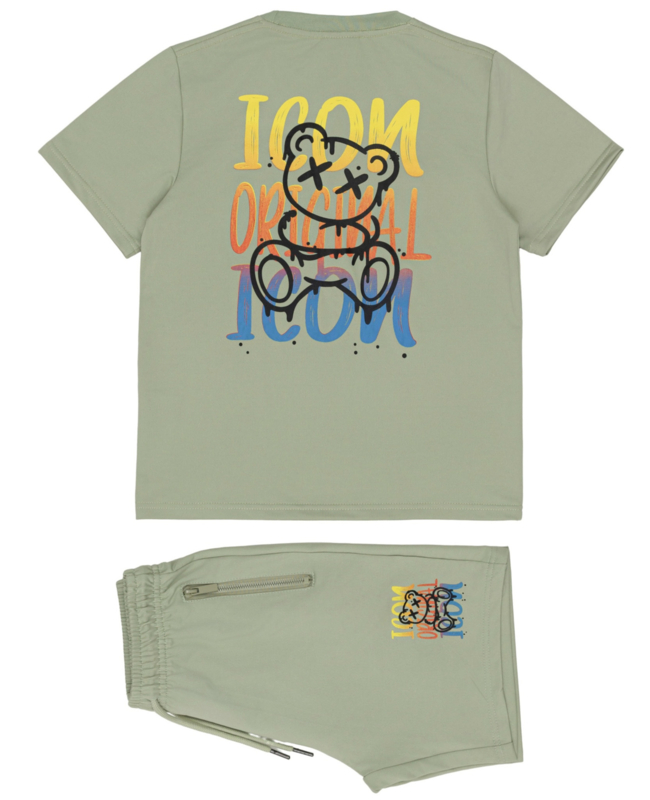 Op het T-shirt staat een grote backprint met de tekst “ICON ORIGINAL ICON” in felle kleuren, gecombineerd met een stoere teddy-illustratie. Op de voorkant zit een kleinere bijpassende print op de borst. De short is afgewerkt met een handige ritszak aan de zijkant en dezelfde kleurrijke print, ideaal voor een sportieve streetstyle look.