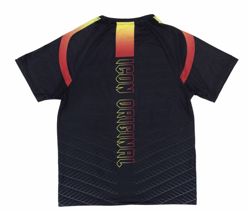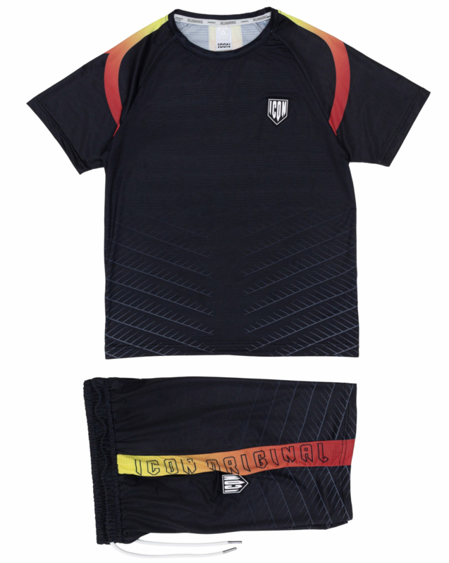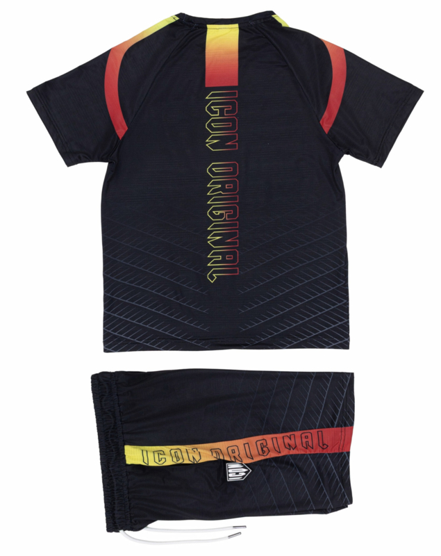 Artikelnummer: 1020-1 OverzichtDeze stoere ICON sport set voor jongens is perfect voor actieve dagen én een trendy streetwear look. De set bestaat uit een ademend sportshirt en een comfortabele short, uitgevoerd in diep zwart met opvallende geel-oranje-rode gradient strepen op de schouders en broek.