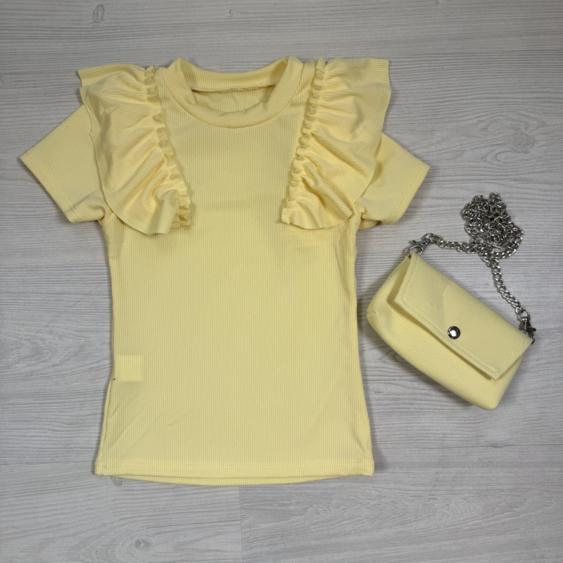Artikelnummer: HN. 7337g OverzichtDeze trendy rib top met ruffle details wordt geleverd inclusief een bijpassend mini tasje – dé perfecte combinatie voor een stijlvolle en speelse look!