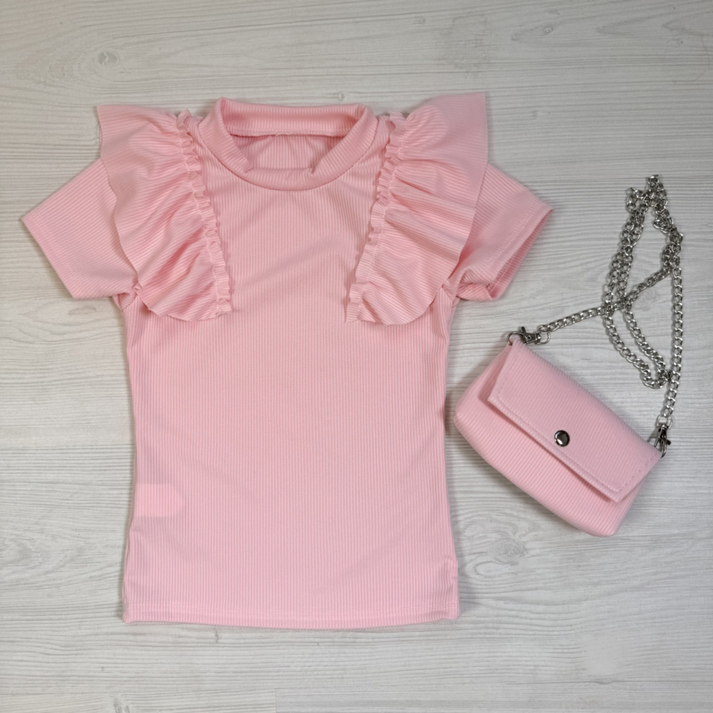 Artikelnummer: HN. 7337lr OverzichtDeze trendy rib top met ruffle details wordt geleverd inclusief een bijpassend mini tasje – dé perfecte combinatie voor een stijlvolle en speelse look!