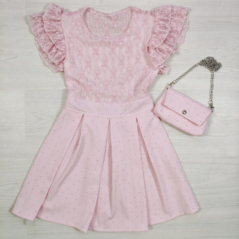 De jurk heeft een luxe kantlook top met speelse ruffle mouwtjes, gecombineerd met een uitlopende rok vol subtiele glittersteentjes voor een sprankelend effect. De bijpassende mini schoudertas met chain strap maakt de outfit helemaal af – perfect voor feestjes, bruiloften of speciale gelegenheden.