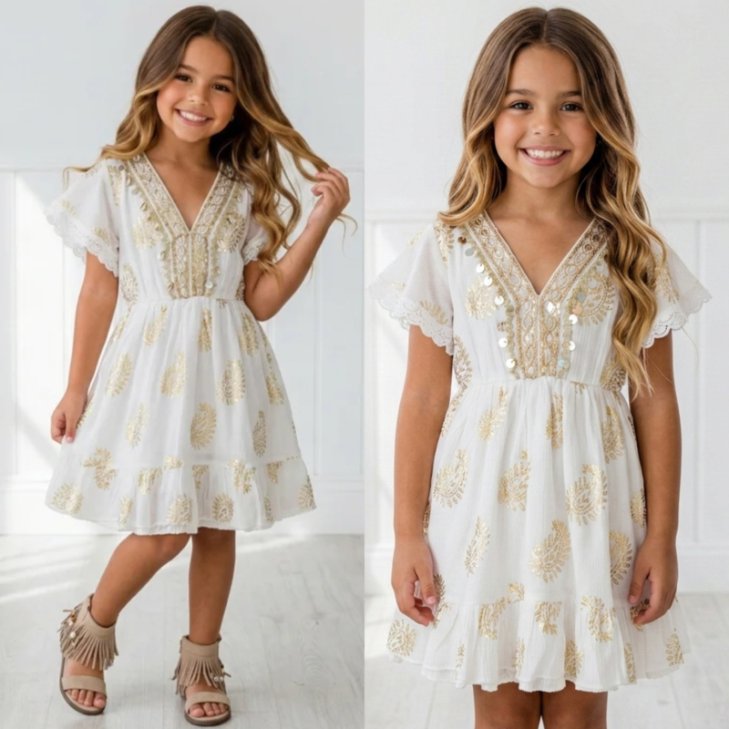 De mooie V-hals is afgewerkt met sierlijke borduursels, subtiele pailletten en kleine muntjes die zorgen voor een unieke, bohemian look. De luchtige stof en wijde mouwtjes maken deze jurk heerlijk comfortabel voor warme dagen. De zwierige rok met ruffle onderaan geeft elke stap een speels effect – perfect voor dansen, spelen en stralen!