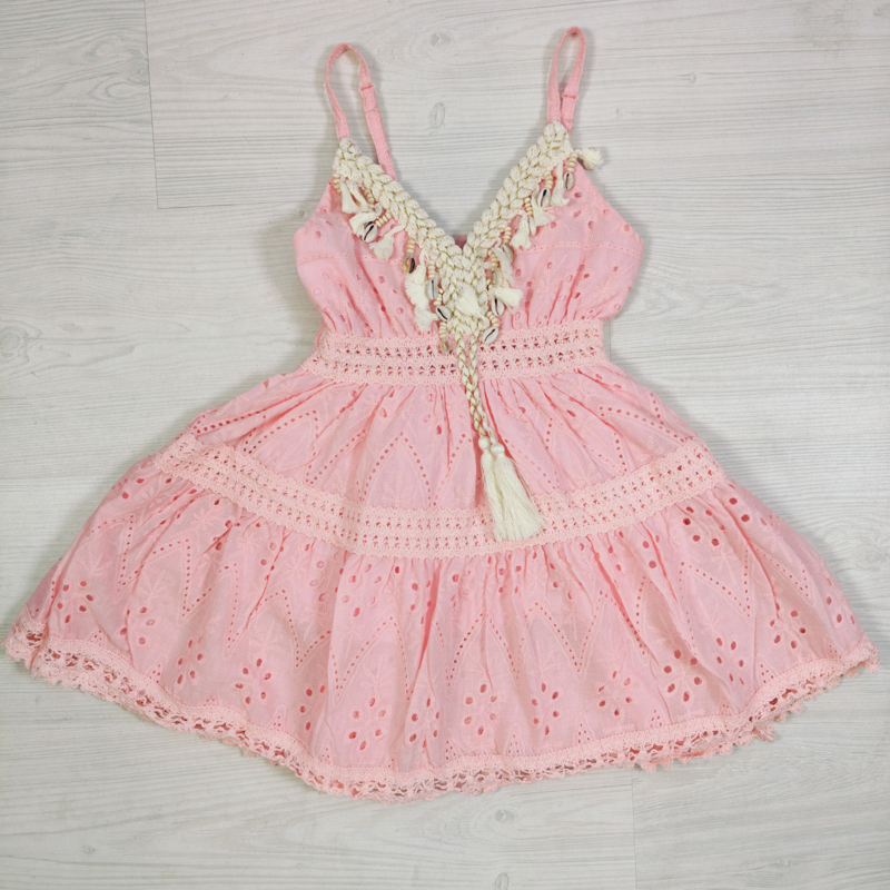 Artikelnummer: HN. 1580r OverzichtDeze prachtige bohemian meisjesjurk is een echte must-have voor zonnige dagen! De jurk heeft een luchtige, speelse uitstraling dankzij de fijne broderie stof en de sierlijke laagjes rok. De V-hals is rijk afgewerkt met schelpjes, kwastjes en gevlochten details, wat zorgt voor een echte Ibiza/boho vibe 🌴