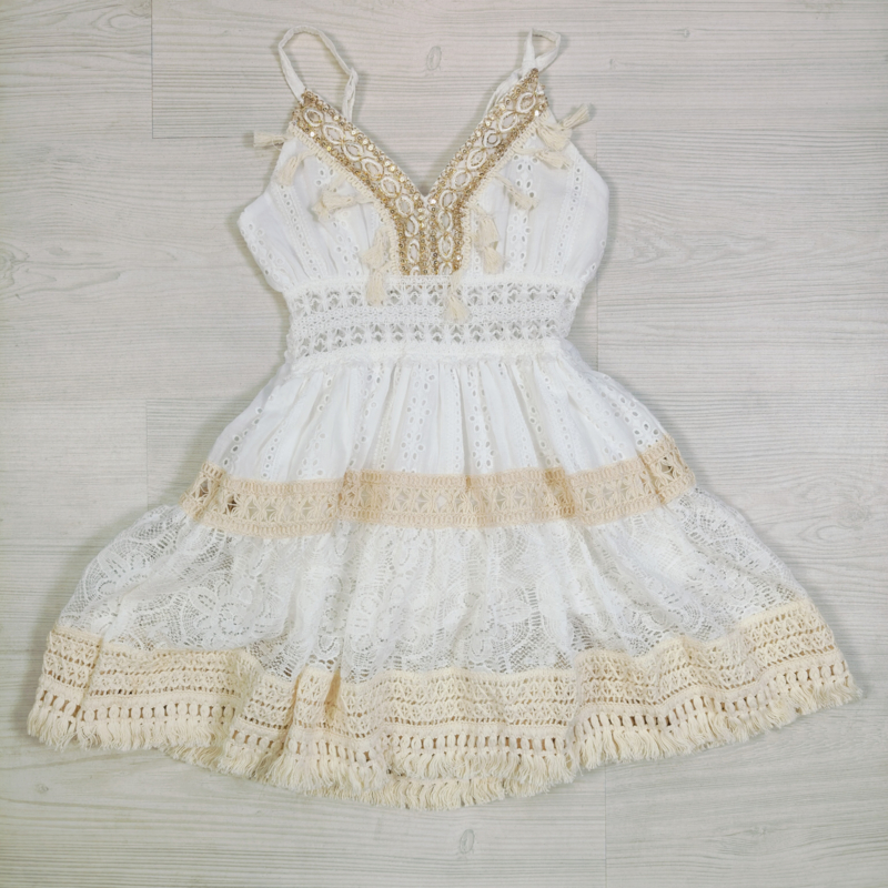 De jurk heeft een elegante V-hals met rijke gouden borduursels en speelse kwastjes, wat zorgt voor een exclusieve Ibiza-look. De rok bestaat uit meerdere lagen met kant en franjes, waardoor de jurk een mooie volle en zwierige pasvorm krijgt.