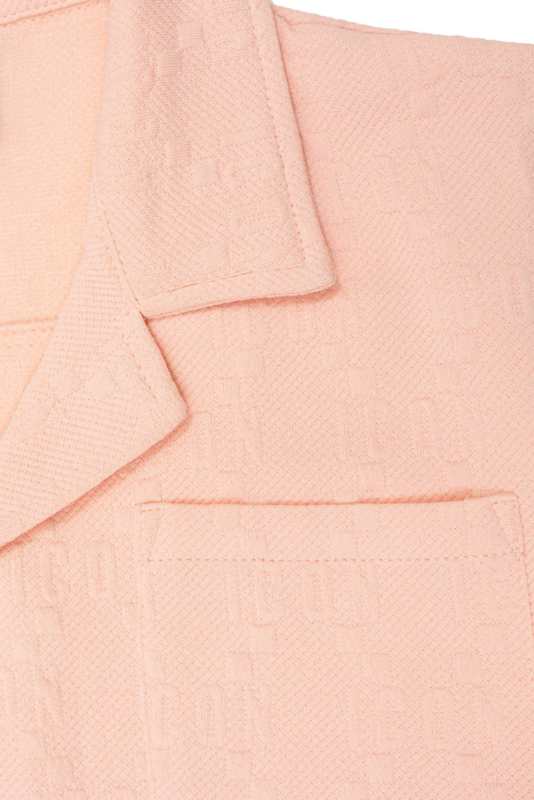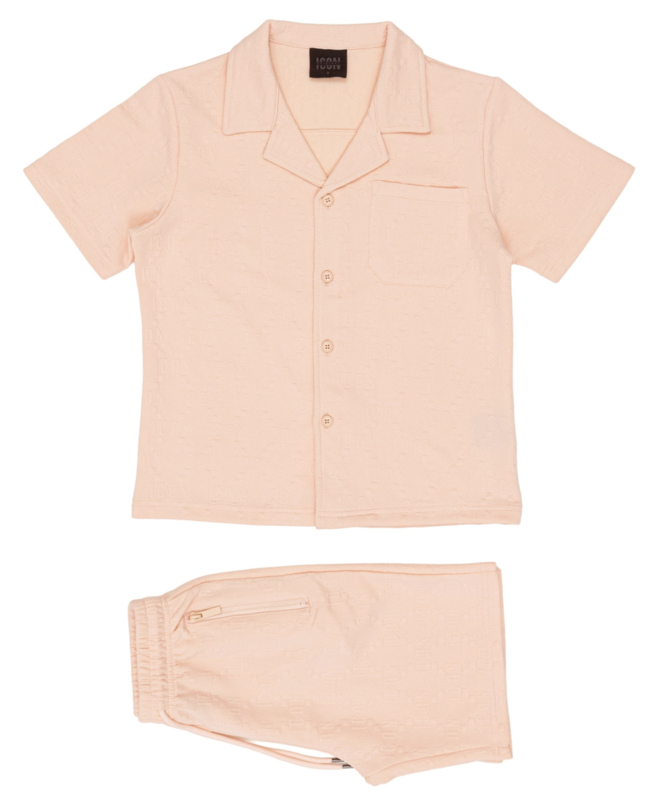Artikelnummer: 1096z bka OverzichtDeze stijlvolle Sunset Set in Peach is de perfecte zomerse outfit voor kids die er trendy én comfortabel uit willen zien. De set bestaat uit een kort mouwen blouse met kraag en een bijpassende short in een zachte perzik/peach kleur. In de stof zit een subtiel monogram patroon, wat de outfit een luxe en moderne uitstraling geeft.