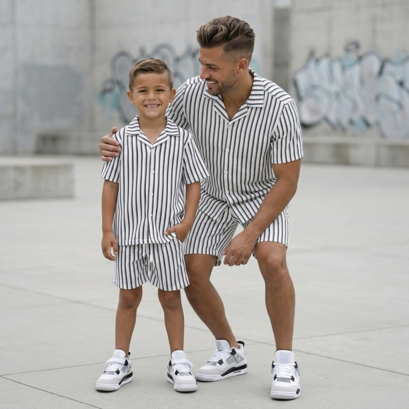 De blouse heeft een nette knoopsluiting, een borstzakje en een relaxte pasvorm, waardoor de set zowel casual als netjes gedragen kan worden. De short is voorzien van een elastische tailleband met trekkoord en een ritszak, zodat hij comfortabel zit tijdens spelen, wandelen of vakantiedagen.