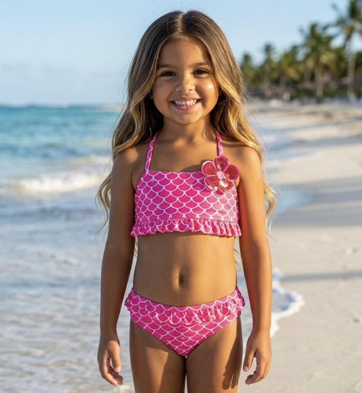 Artikelnummer: HN.1398f ww2 OverzichtMet de Mermaid Scales Bikini Set steel je gegarandeerd de show op het strand of bij het zwembad. Deze vrolijke meisjesbikini heeft een prachtige fuchsia kleur met speelse zeemeermin-schubbenprint die zorgt voor een echte summer look.