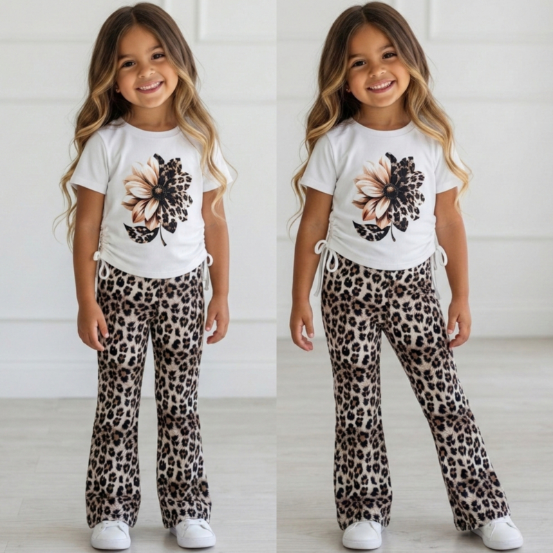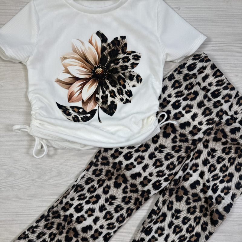 Artikelnummer: HN.2267 OverzichtDeze trendy meisjes set met leopard print en bloemen top is een echte eyecatcher. De set bestaat uit een zachte witte top met een grote bloemprint met leopard details en een bijpassende flared broek met leopard print. De speelse combinatie van bloemen en panterprint zorgt voor een modieuze en stoere look.