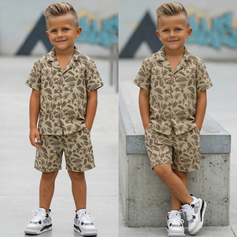 Artikelnummer: 9212b ww1 OverzichtDeze stoere jongens zomer set is perfect voor warme dagen. De set bestaat uit een stijlvol korte mouwen overhemd met tropische bladerenprint en een bijpassende short, wat zorgt voor een trendy en comfortabele zomerlook.