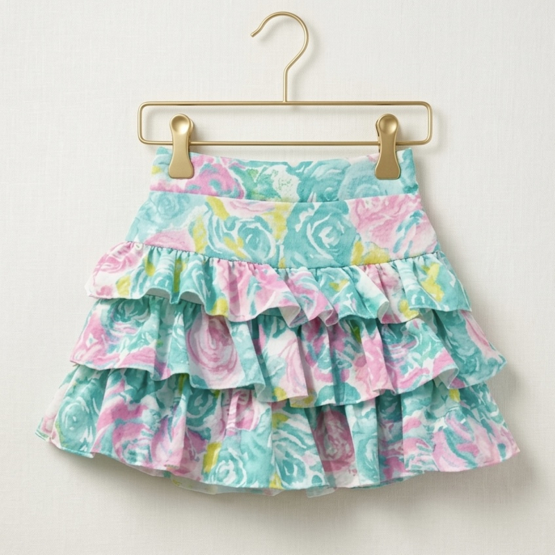 Artikelnummer: HN.cb ww2 OverzichtDeze super vrolijke pastel rok met bloemenprint is een echte eyecatcher voor meisjes die van kleur en beweging houden. De rok heeft meerdere speelse ruffle lagen, waardoor hij prachtig zwiert bij elke stap. De zachte tinten mint, roze en een vleugje geel geven de rok een frisse en zomerse uitstraling.