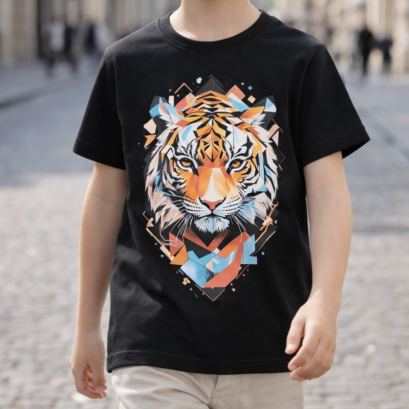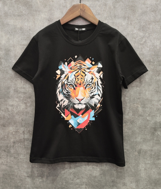 Artikelnummer: 234z ww2 OverzichtDit T-shirt heeft een opvallende tijgerprint in een unieke geometrische stijl met felle kleuren zoals oranje, blauw en rood. De krachtige uitstraling van de tijger gecombineerd met de moderne graphic details maakt dit shirt een echte must-have voor kids die durven op te vallen.