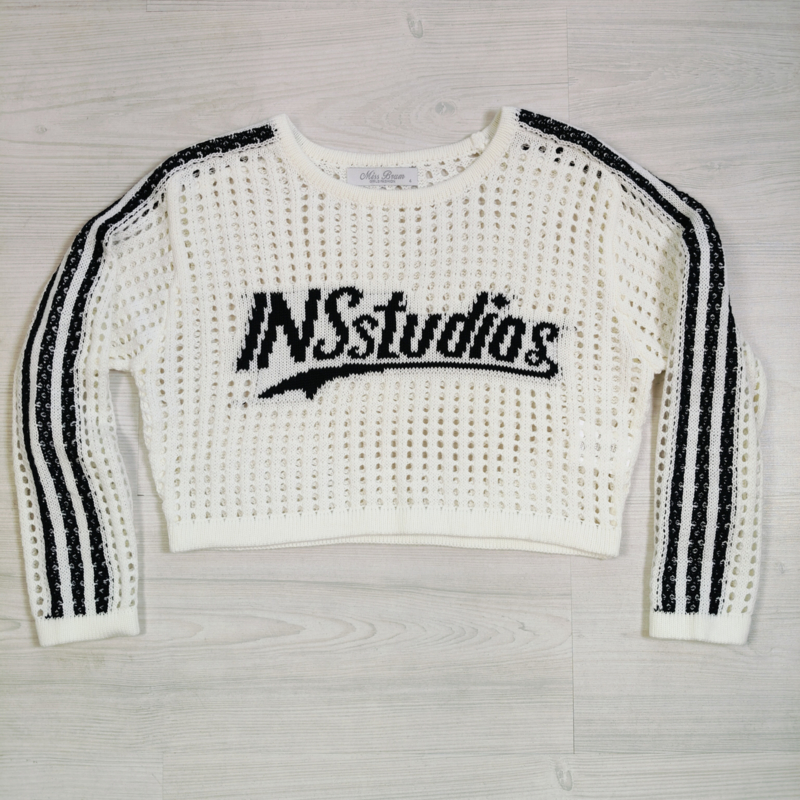 De opvallende “INS Studios” tekst op de voorkant en de sportieve strepen op de mouwen maken deze sweater helemaal af. Perfect om te combineren met een top, body of hemdje eronder voor een layered look.