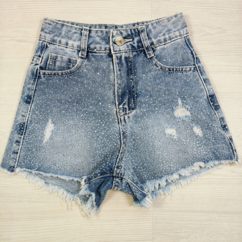 Artikelnummer: LG.313 OverzichtDeze stoere Shine Edge Denim Shorts is een echte must-have voor meiden die houden van een edgy én girly look! De lichtblauwe denim short is afgewerkt met subtiele glinsterende steentjes en trendy ripped details, wat zorgt voor een perfecte balans tussen stoer en stylish.