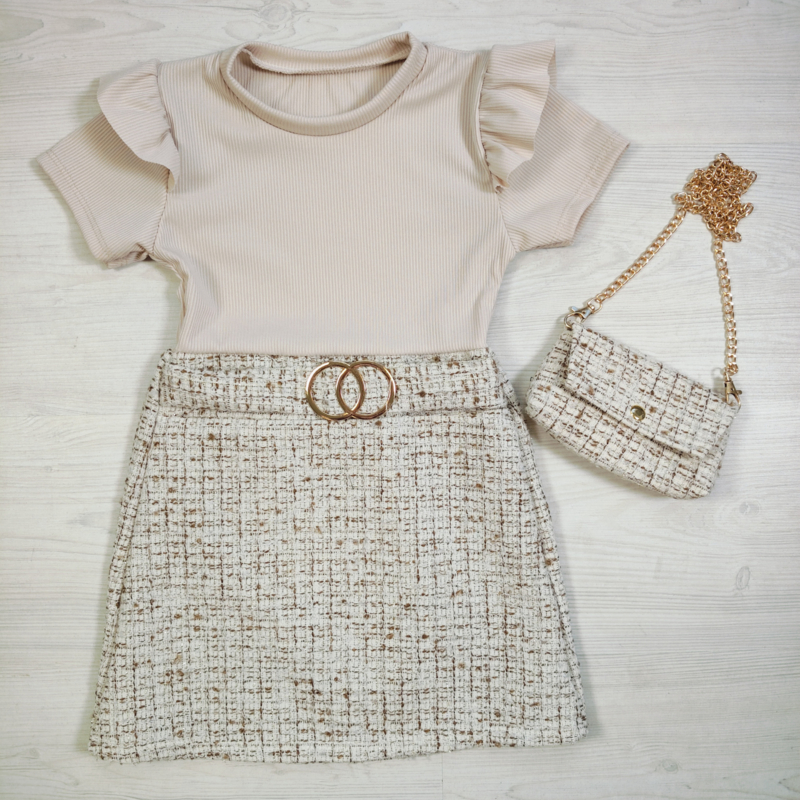 Artikelnummer: HN.70516b ww1 OverzichtDeze elegante meisjes jurk heeft een luxe uitstraling en is perfect voor een stijlvolle look! De combinatie van een zachte rib top met ruffle mouwtjes en een chique tweed rokje geeft dit jurkje een echte designer vibe.