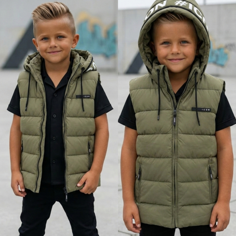 Artikelnummer: 1210b ww2 OverzichtDeze stoere #ICON hooded bodywarmer voor kinderen is een echte must-have voor een trendy streetstyle look. De bodywarmer heeft een moderne puffer look met capuchon, een opvallende #ICON print op de rand van de capuchon en een subtiel ICON logo op de borst.