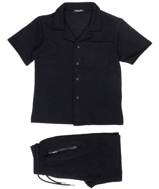 Artikelnummer: 1091/1442 bka OverzichtOp zoek naar een stijlvolle én comfortabele set die je samen kunt dragen? Deze zwarte zigzag structuur set is dé perfecte keuze voor een trendy twinning look! De set bestaat uit een luchtig knoopshirt met korte mouwen en een bijpassende short met elastische tailleband.