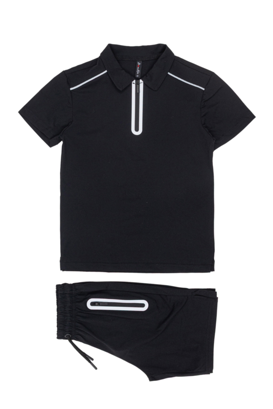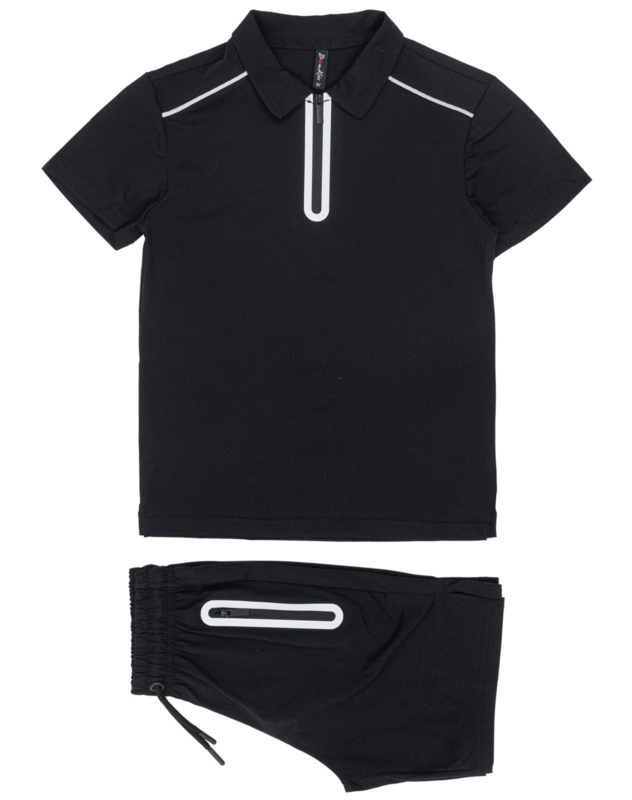 Artikelnummer: 762z bka OverzichtDeze stijlvolle zwarte polo set met rits is dé perfecte combinatie van sportief en modern. De set bestaat uit een polo met korte mouwen en een bijpassende short, beide voorzien van strakke witte accenten en een trendy ritssluiting.