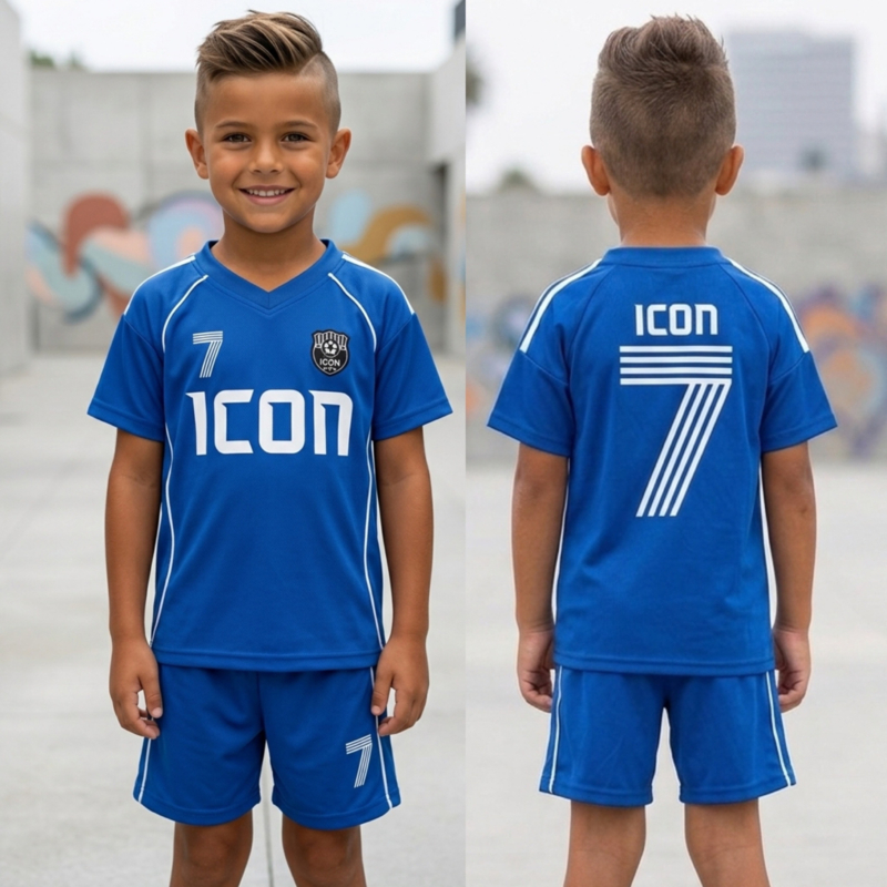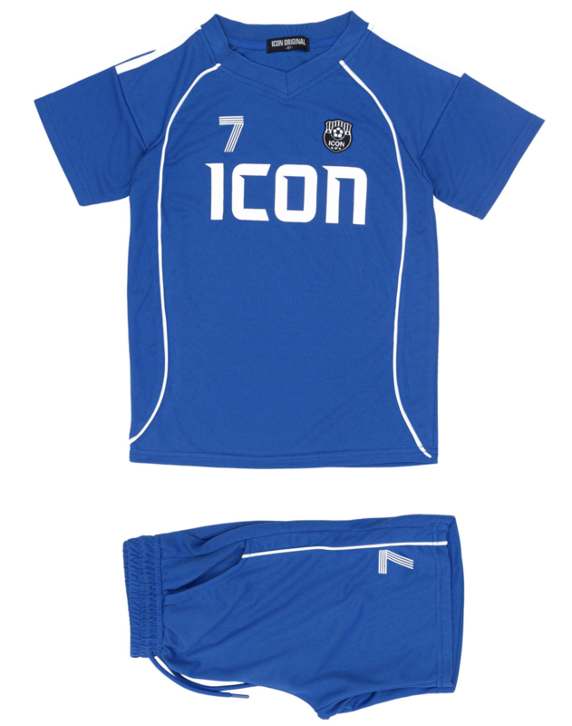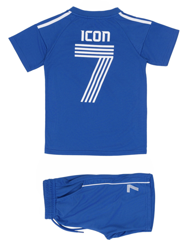 Artikelnummer: 1704b OverzichtDeze ICON voetbal set in blauw en wit is een stoere en sportieve outfit voor jongens die van voetbal en actieve kleding houden. De tweedelige set bestaat uit een sportshirt met korte mouwen en een bijpassende short en heeft een moderne sportlook met het ICON logo en rugnummer 7.