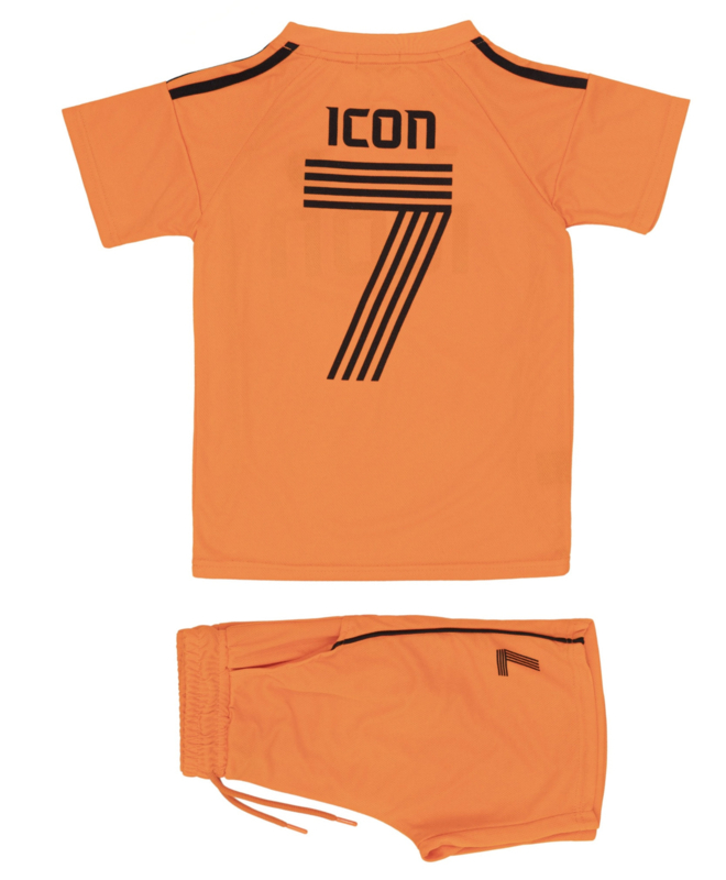 Artikelnummer: 1704or OverzichtDeze ICON voetbal set in oranje en zwart is een stoere en sportieve outfit voor jongens die van voetbal en actieve kleding houden. De tweedelige set bestaat uit een sportshirt met korte mouwen en een bijpassende short en heeft een moderne voetbalstijl met het ICON logo en rugnummer 7.