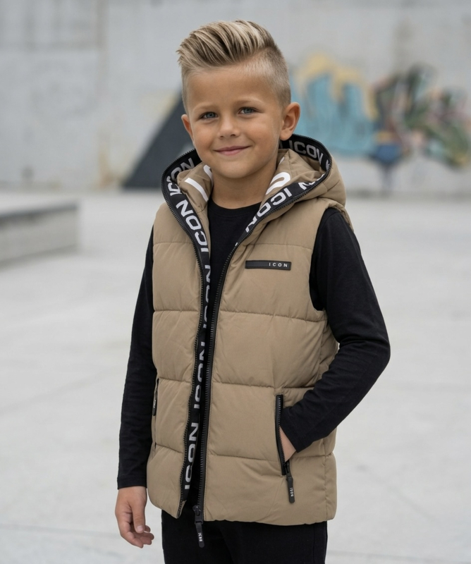 Artikelnummer: 1212b OverzichtDeze stoere ICON bodywarmer voor jongens is perfect voor frisse dagen in het voorjaar, najaar of op een koele zomeravond. De beige bodywarmer heeft een moderne streetwear look en is afgewerkt met opvallende ICON details in de capuchon, wat zorgt voor een extra stoere uitstraling.