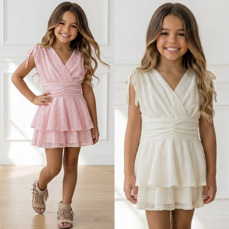 Verkrijgbaar in een romantische roze kleur en een elegante crème variant — perfect voor meisjes die houden van een lieve en stijlvolle outfit.
