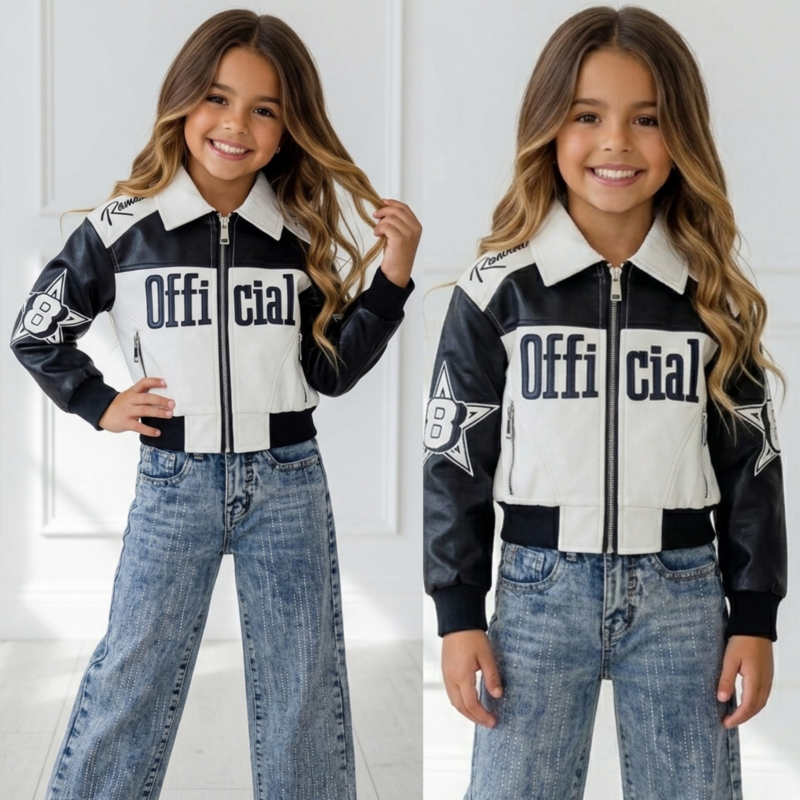 Artikelnummer: LG.YY9961 ww2 OverzichtDit stoere meisjes bikerjack is een echte eyecatcher! Het zwart-witte design met opvallende “Offical” en “Romantic” details geeft het jasje een trendy streetstyle uitstraling.