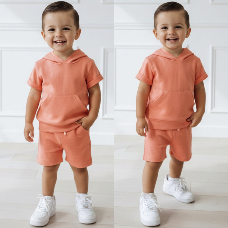 Artikelnummer: 25bg015o OverzichtDit comfortabele zomer setje voor baby’s en peuterjongens bestaat uit een zachte hoodie met korte mouwen en een bijpassende short in een warme koraalkleur. De hoodie heeft een speelse capuchon en buidelzak, wat zorgt voor een stoere maar lieve uitstraling.