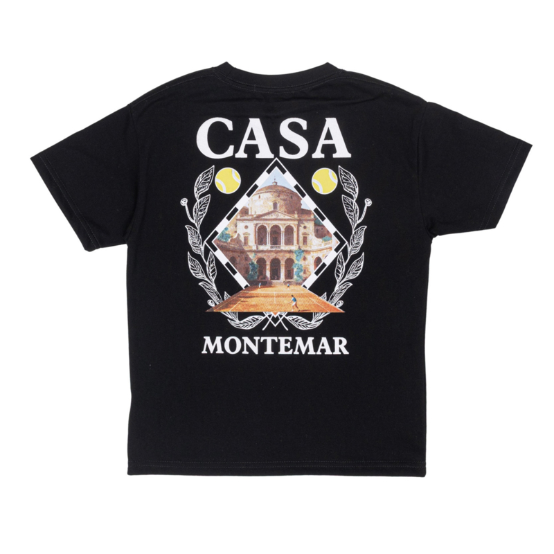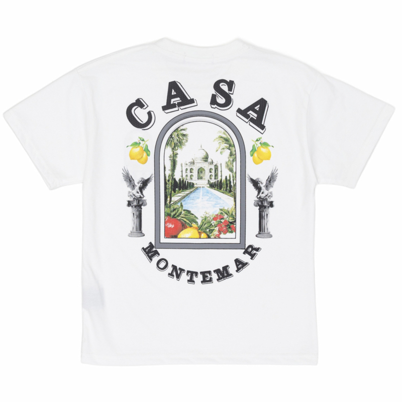 Artikelnummer: 1712w bka OverzichtDit witte CASA Montemar T-shirt voor jongens heeft een stijlvolle en opvallende look. Op de borst staat een kleine print met een klassieke tuin en paleis, terwijl de achterkant een grote CASA Montemar graphic laat zien met palmbomen, citrusvruchten en een indrukwekkend paleisachtig gebouw. Dit geeft het shirt een luxe en zomerse uitstraling.
