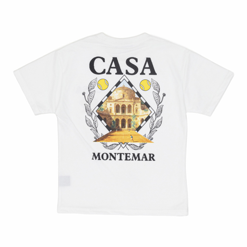 Artikelnummer: 1716w bka OverzichtDit witte CASA Montemar T-shirt voor jongens heeft een frisse en sportieve uitstraling. Op de achterkant staat een grote CASA Montemar graphic met een klassieke mediterrane villa en een tennisbaan, aangevuld met tennisballen en stijlvolle bladeren. Dit geeft het shirt een luxe tennis club / Riviera vibe die perfect past bij de huidige streetwear trend.