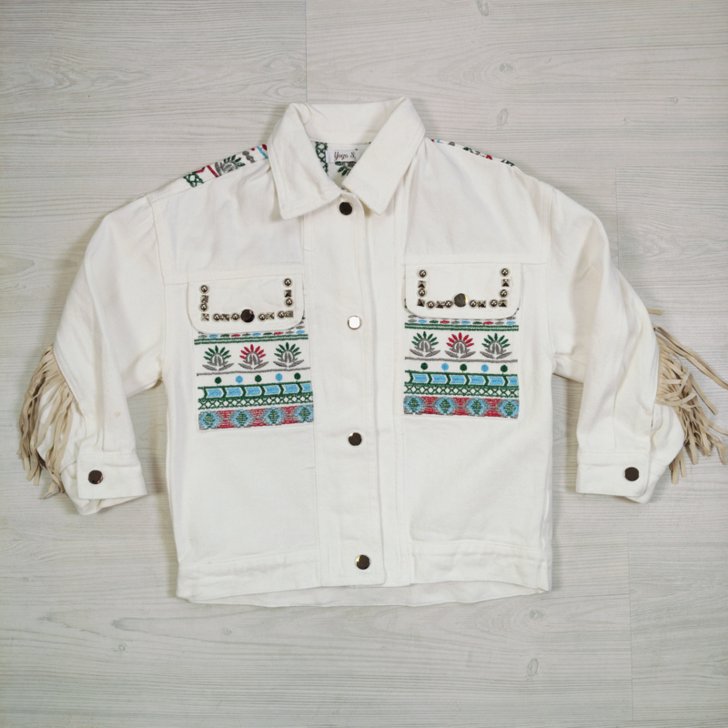 Artikelnummer: LG.YY8223w OverzichtDit boho meisjes jasje met franjes is een echte eyecatcher! Het jasje heeft een stoere western en bohemian uitstraling dankzij de kleurrijke borduursels, sierstuds en speelse franjes op de mouwen en achterkant. De combinatie van het etnische patroon en de zachte franjes geeft het jasje een unieke en trendy look.