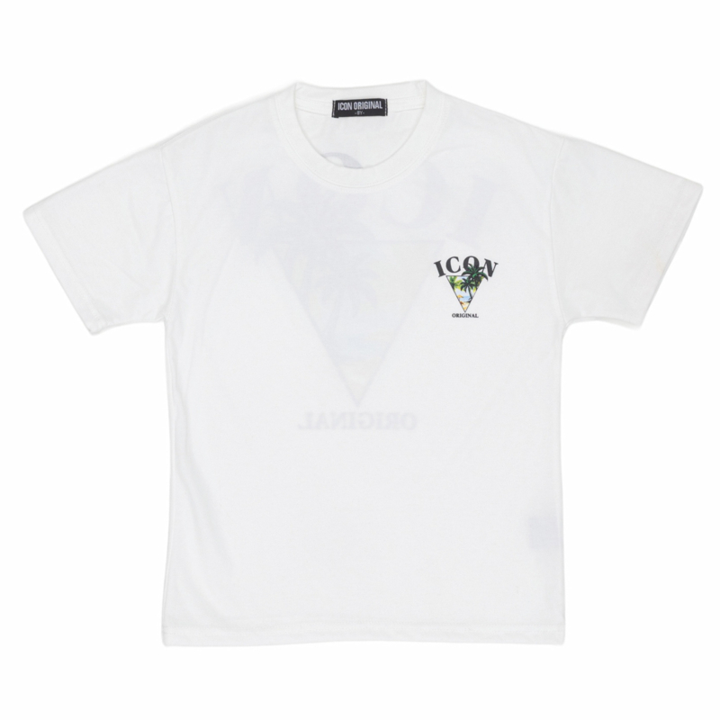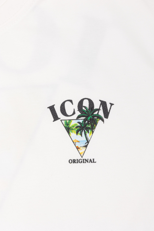 Artikelnummer: 1721w bka OverzichtDit witte ICON Original T-shirt voor jongens heeft een frisse en zomerse uitstraling. Op de achterkant staat een grote ICON print met tropische palmbomen en een strandscene, wat het shirt een echte beach en vakantie vibe geeft. Onder de graphic staat de tekst ICON Original, wat zorgt voor een stoere streetwear look.