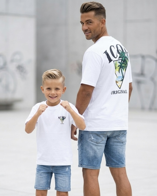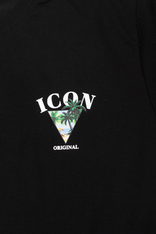 Artikelnummer: 1721z bka OverzichtDit zwarte ICON Original T-shirt voor jongens heeft een stoere en zomerse uitstraling. Op de achterkant staat een grote ICON print met tropische palmbomen en een strandscene, wat het shirt een echte beach en vakantie vibe geeft. Onder de graphic staat de tekst ICON Original, wat zorgt voor een trendy streetwear look.